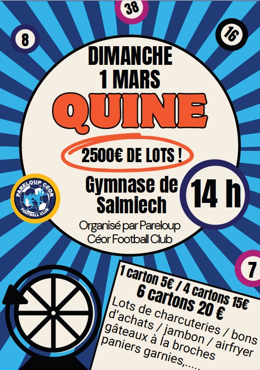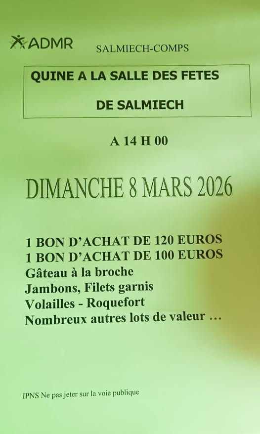 - Actualités - | Météo à Salmiech VIGILANCE M É T É O J A U N E SITUATION MÉTÉOROLOGIQUE À SURVEILLER pour un risque de VENT VIOLENT le 18 février 2026 à partir de 10h30 CLIQUEZ ICI : vigilance jaune L'agenda de Salmiech Elections Municipales 2026 15 et 22 mars 2026 Absent ? Pensez au vote par procuration !! _______________________ FERMETURE DE L'Agence POSTALE 20/02/2026 Recensement de la population du 15 janvier 2026 au 14 février 2026 LES RESULTATS SERONT VISIBLES SUR LE SITE DE L'INSEE COURANT 2026 ____________________________ Divers Objets trouvés disponibles en mairie : gilets et veste enfants, clés de voiture Veuillez contacter la mairie pour plus d'informations ____________________________________ Ruralinette ________________________________________ Informations travaux : VOIE DE SRREMEJANE - Travaux de réseau du 1er décembre pour 60 jours (cliquez ici) SALMIECH - TRAVAUX RUE DU FOIRAIL du 5 novembre 2025 au 31 janvier 2026 (cliquez ici) LACAN - Branchement ENEDIS à partir du 20 octobre pour 15 jours (cliquez ici) La Bastide - enfouissement réseau ENEDIS à partir du 14 avril (cliquez ici) ___________________________________ Informations diverses : Arrêté préfectoral - Effarouchement ou régulation administrative de corneilles noires (cliquez ici) Arrêté départemental - vitesse maximale autorisée entre la Primaube et Cassagnes-Begonhes (RD 902) (cliquez ici) _________________________ La vie associative à Salmiech _______________________ Cantine scolaire Retrouvez le menu de la semaine directement sur le site internet de notre prestataire (cliquez ici) ___________________________________ Votre enfant va avoir 16 ans, pensez à passer en Mairie pourqu'il soit recensé Ci-dessous le lien d'accès rapide aux délibérations Bulletins municipaux, délibérations et arrêtés permanents Planning et réservation des salles |